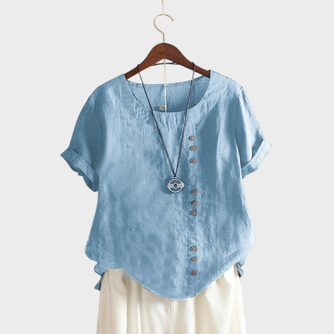 Ova bluza donosi savršen balans između ležernosti i elegancije. Asimetrični raspored gumba daje joj moderan i poseban izgled, dok lagani materijal osigurava prozračnost i udobnost tijekom cijelog dana. Idealna je za svakodnevne kombinacije, ali i za posebne prilike kada želite izgledati drugačije i sofisticirano.