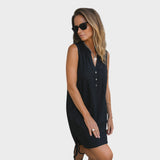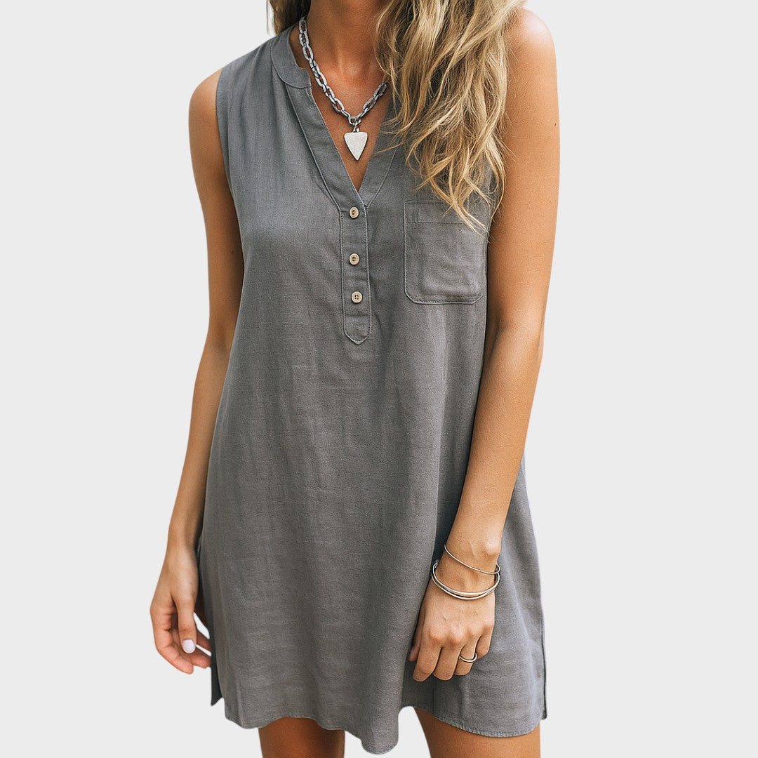 Ova lagana i prozračna haljina savršen je izbor za tople dane. Bez rukava, s modernim V-izrezom i dekorativnim gumbićima, pruža udobnost i jednostavnu eleganciju. Praktičan džep sprijeda dodaje poseban detalj i čini je još funkcionalnijom. Idealna je za šetnje, odmor ili opuštene susrete s prijateljima.